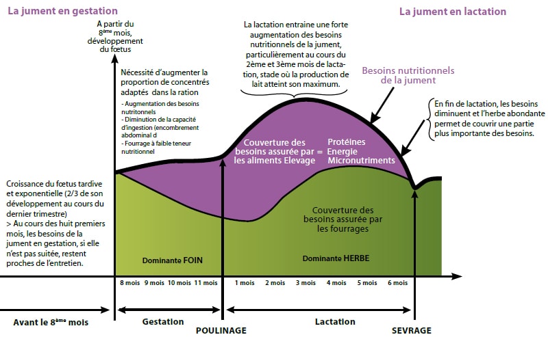 La croissance du fœtus est tardive et exponentielle (les 2/3 de son développement se fait au cours du dernier trimestre). Au cours des huit premiers mois, les besoins de la jument en gestation, si elle n’est pas suitée, restent proches de l’entretien. A partir du 8ème mois de gestation, les besoins nutritionnels augmentent, pour couvrir le développement du fœtus : à 8 mois de gestation, le fœtus ne pèse que 8 kg. Il commence réellement sa croissance pour atteindre 50 kg à la naissance. Il prend donc plus de 40 kg dans les 3 derniers mois.